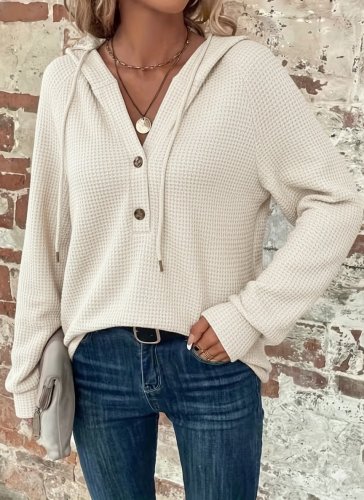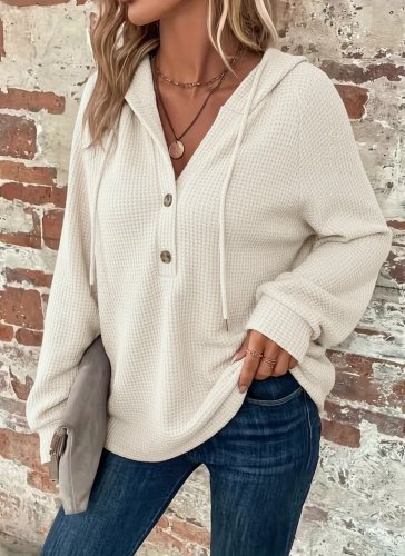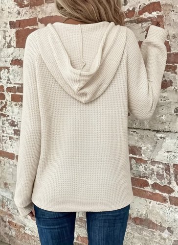Kadın uzun kollu kapşonlu önü düğmeli ve bağcıklı waffle bluz